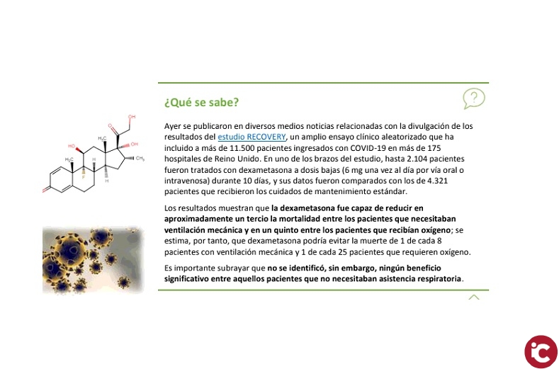 En el día de ayer se publicaron en diversos medios noticias relacionadas con la divulgación de los resultados del estudio RECOVERY, un amplio ensayo clínico aleatorizado que ha incluido a más de 11.500 pacientes ingresados con COVID-19 en más de 175 hospitales de Reino Unido. En uno de los brazos del estudio, hasta 2.104 pacientes fueron tratados con dexametasona a dosis bajas (6 mg una vez al día por vía oral o intravenosa) durante 10 días, y sus datos fueron comparados con los de 4.321 pacientes que recibieron los cuidados de mantenimiento estándar.