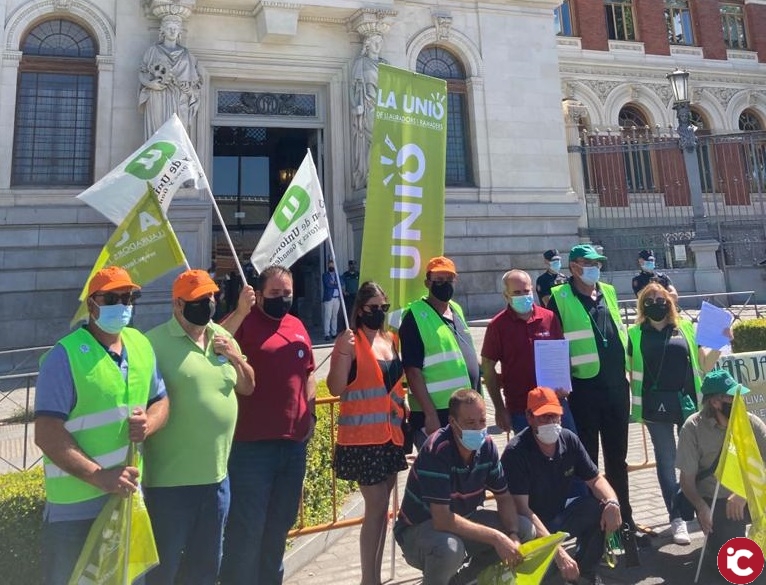 Una representación de agricultores de LA UNIÓ de diferentes puntos de la Comunitat Valenciana, junto a los de varias comunidades autónomas convocados por su organización estatal Unión de Uniones, se ha concentrado hoy a las puertas del Ministerio de Agricultura en Madrid para reclamar un futuro digno para el campo valenciano, por una PAC más mediterránea y exigir medidas para el sector vitivinícola.