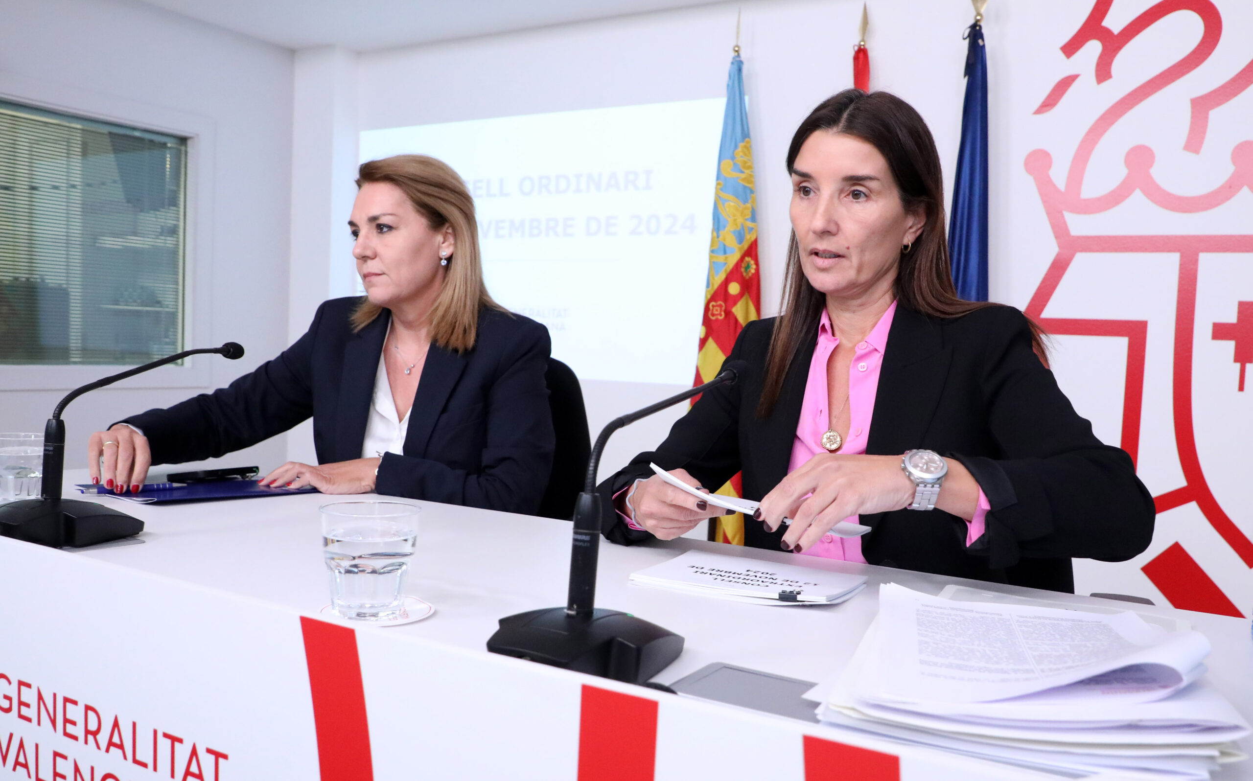La vicepresidenta i consellera de Servicis Socials, Igualtat i Vivenda, Susana Camarero, i la portaveu i consellera d’Hisenda, Ruth Merino, han comparegut en roda de premsa per a informar dels assumptes abordats en el Ple del Consell, que s’ha reunit en sessió ordinària i extraordinària, per a aprovar mesures d’ajudes i de reparació de les conseqüències de la DANA.