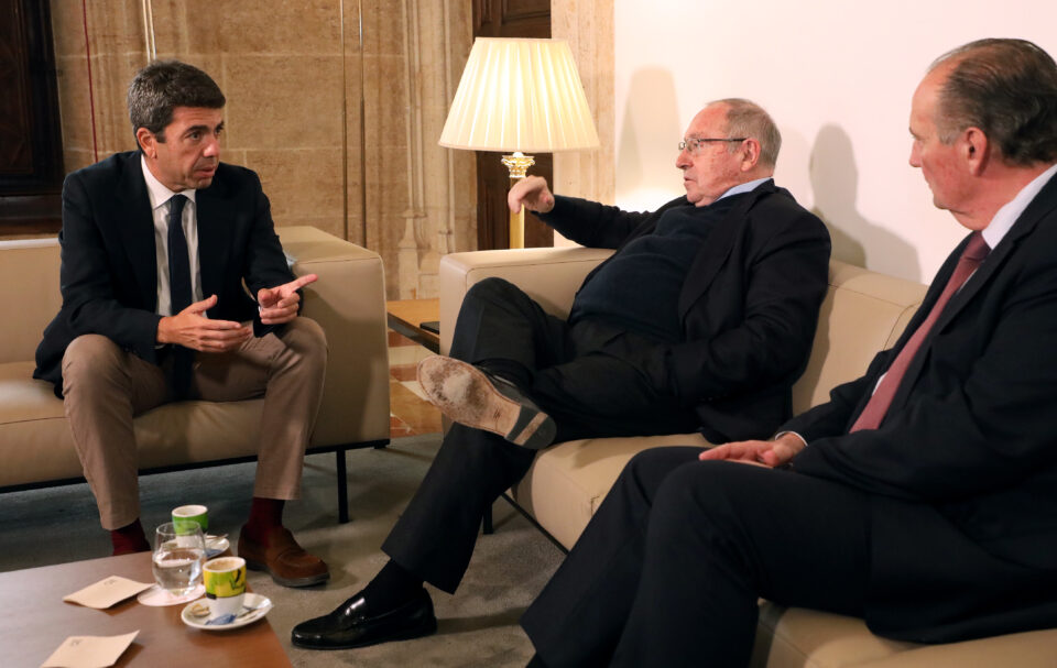 El president de la Generalitat, Carlos Mazón, ha mantenido una reunión con el presidente de la Cámara de Comercio de España y de la Fundación INCYDE, José Luis Bonet, y el presidente del Consejo de Cámaras de la Comunitat Valenciana, José Vicente Morata, para analizar las medidas que se están poniendo en marcha para apoyar a empresas, autónomos, comercios o pymes damnificados por las riadas, así como el Plan Estratégico diseñado por la institución cameral a través de la Fundación INCYDE.