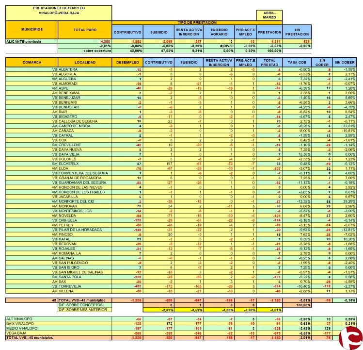 Tras analizar los datos de los Servicios Públicos de Empleo sobre las prestaciones en el mes de ABRIL, la cobertura de las personas en paro es del 44.62% en el ámbito de Vinalopó- Vega Baja (37.381 personas).