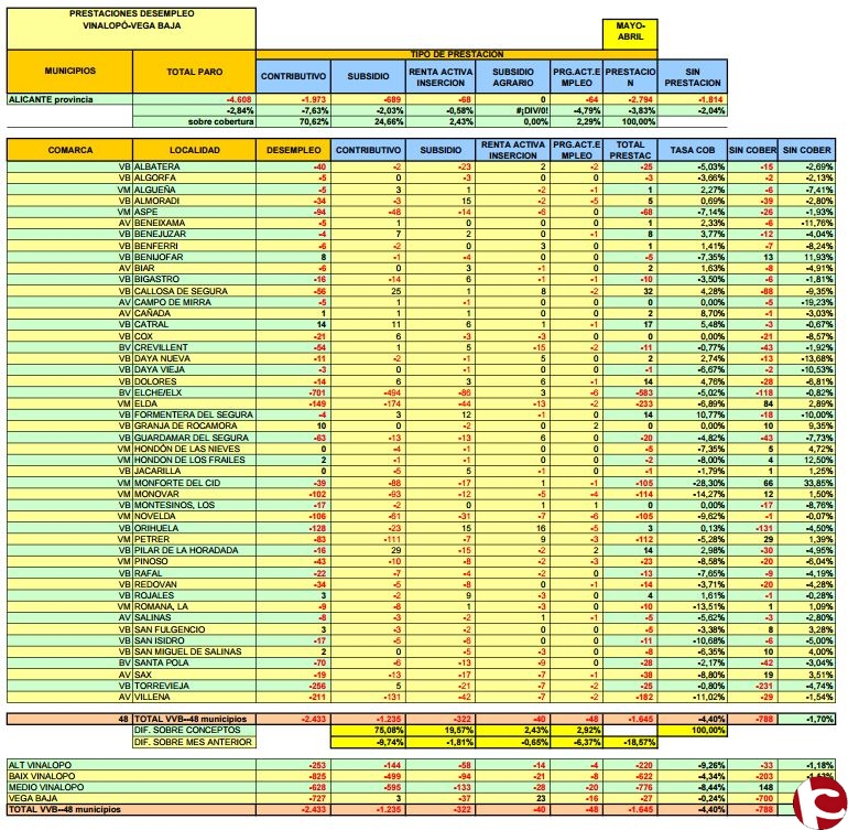 Tras analizar los datos de los Servicios Públicos de Empleo sobre las prestaciones en el mes de MAYO, la cobertura de las personas en paro es del 43.93% en el ámbito de Vinalopó- Vega Baja (35.736 personas). Comparando los datos con el mes anterior, vuelve aumentar porcentualmente las personas sin cobertura.