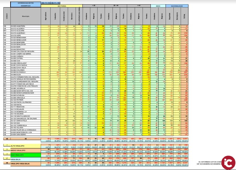 CCOO Vinalopó-Vega Baja ha elaborado un informe con relación a las personas registradas en el desempleo, de acuerdo con los datos facilitados por el SEPE y LABORA-SERVEF. Al finalizar el 30 de Noviembre el resultado es el siguiente respecto al mes anterior: