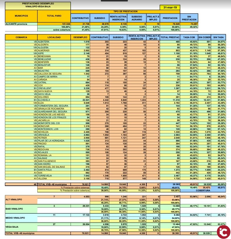 En la provincia de Alicante, en Marzo de 2015, había 91.317 personas que tenían alguna prestación, sobre un total de paro registrado de 199.751 personas, mientras que en el mismo mes de 2019 las personas que tienen alguna de las distintas modalidades de prestaciones son 76.549 personas con un dato de paro registrado de 151.046 en el conjunto de la provincia.