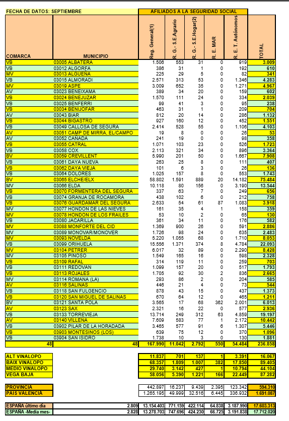 Los datos de AFILIACION a la SEGURIDAD SOCIAL del mes de SEPTIEMBRE, y habiendo analizado los mismos, adjuntamos los correspondientes datos-ficheros con el total de personas que están dadas de Alta último día del mes- a la Seguridad Social, en el mes de SEPTIEMBRE, por Municipios y Comarcas, Provincia y Comunitat Valenciana, así mismo en España con el mismo criterio último día del mes y la media del mes de personas en alta en la seguridad social en España.