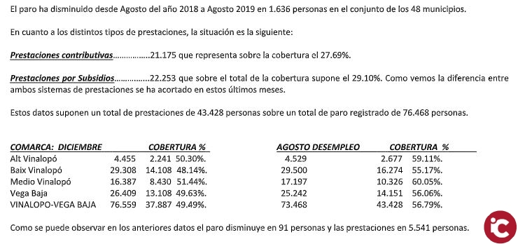 En la provincia de Alicante, en Agosto de 2015, había 91.542 personas que tenían alguna prestación, sobre un total de paro registrado de 185.240 personas, mientras que en el mismo mes de 2019 las personas que tienen alguna de las distintas modalidades de prestaciones son 81.339 personas con un dato de paro registrado de 144.275 en el conjunto de la provincia.
