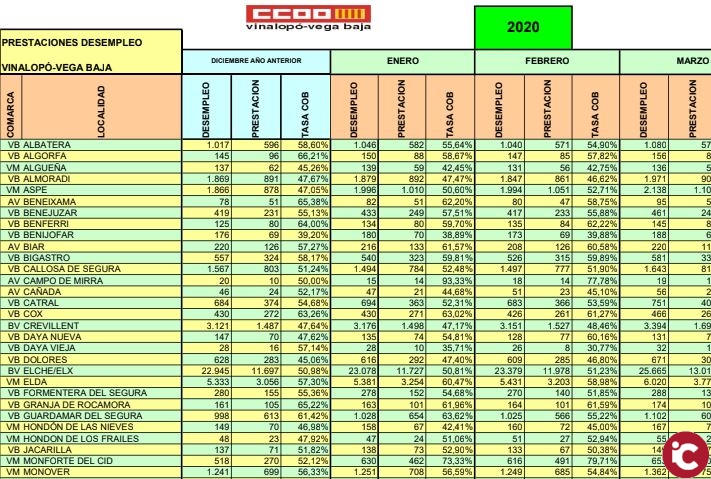 En la provincia de Alicante, en Marzo de 2016 había 79.941 personas que tenían alguna prestación, sobre un total de paro registrado de 180.706 personas, mientras que en el mismo mes de 2020 las personas que tienen alguna de las distintas modalidades de prestaciones son 87.432 personas con un dato de paro registrado de 164.840 en el conjunto de la provincia.