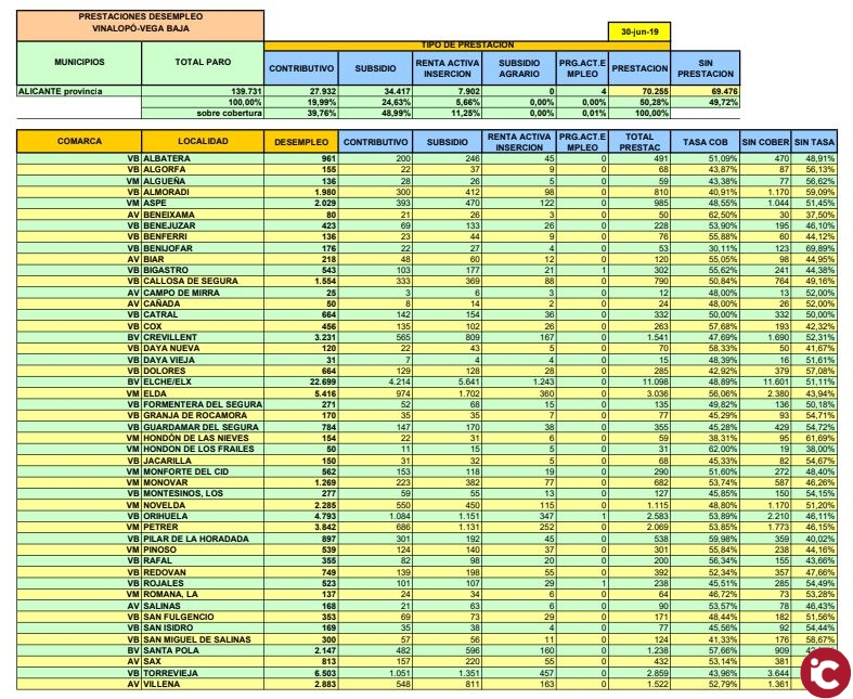 En la provincia de Alicante, en Junio de 2015, había 84.546 personas que tenían alguna prestación, sobre un total de paro registrado de 185.002 personas, mientras que en el mismo mes de 2019 las personas que tienen alguna de las distintas modalidades de prestaciones son 70.255 personas con un dato de paro registrado de 139.731 en el conjunto de la provincia.