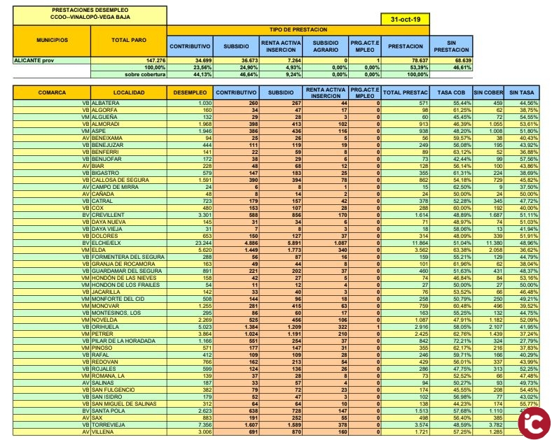 En la provincia de Alicante, en Octubre de 2015, había 84.672 personas que tenían alguna prestación, sobre un total de paro registrado de 186.795 personas, mientras que en el mismo mes de 2019 las personas que tienen alguna de las distintas modalidades de prestaciones son 78.637 personas con un dato de paro registrado de 147.276 en el conjunto de la provincia.