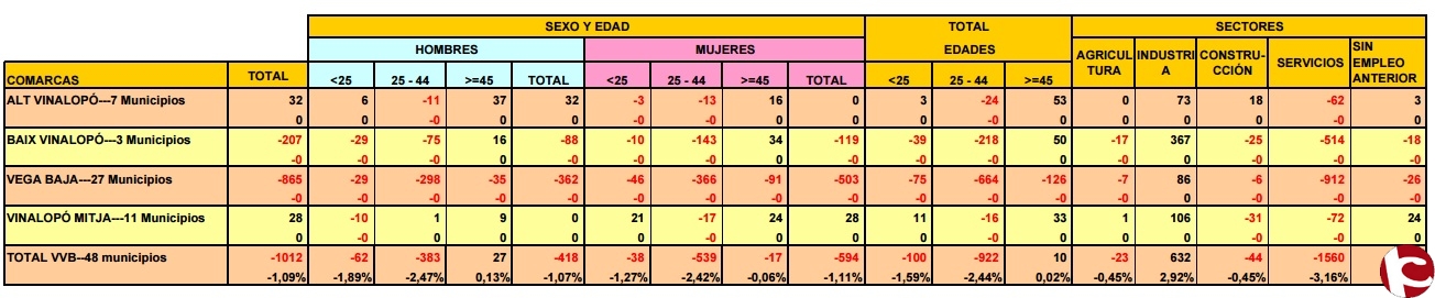 De acuerdo con los datos anteriores y que se pueden observar en los informes adjuntos, el total de personas registradas en las Comarcas VINALO-VEGA BAJA son 92.793 personas registradas en las Oficinas del SEPE, esto supone una disminución sobre el mes anterior de 1.012 personas. Dichos datos se observan por cada uno de los Municipios. Resaltar la mayor bajada en la Comarca Vega Baja.
