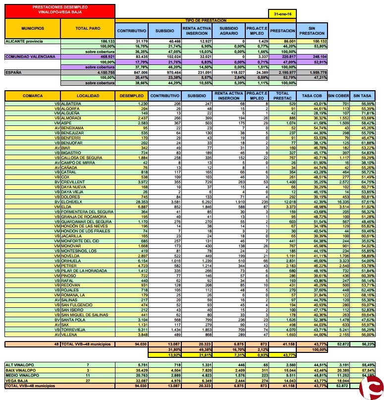Desde CCOO nos adjuntan hoja con la información por: Provincia de Alicante, Comunidad, España y por Municipios que componen las Comarcas del Vinalopo-Vega Baja.
