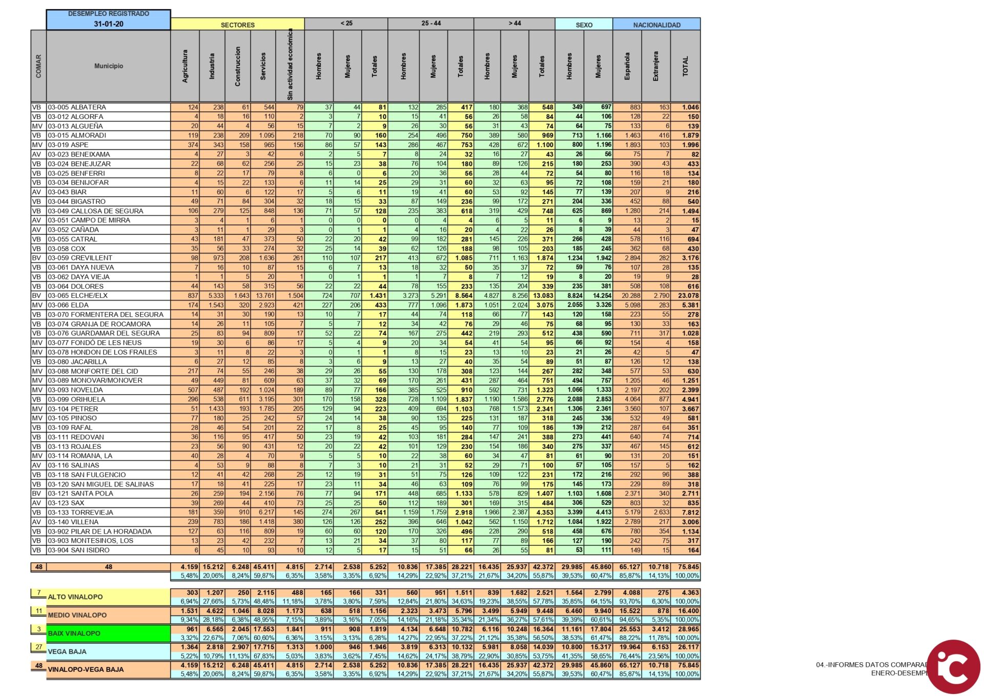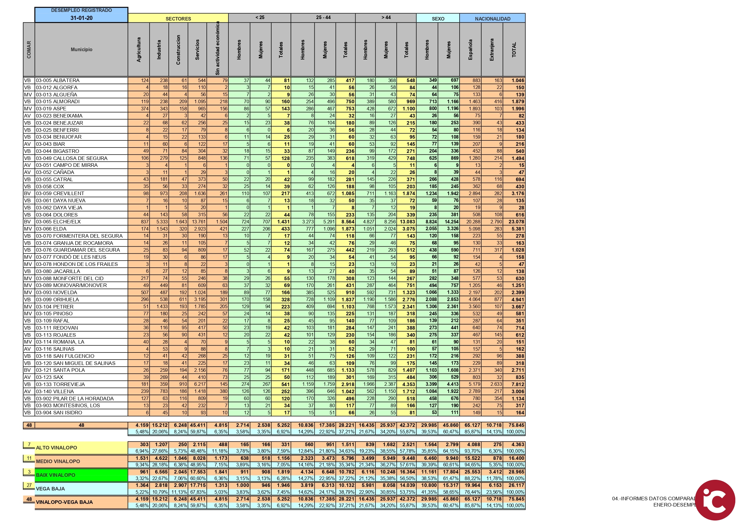 CCOO Vinalopó-Vega Baja ha elaborado un informe con relación a las personas registradas en el desempleo, de acuerdo con los datos facilitados por el SEPE y LABORA-SERVEF. Al finalizar el 31 de Enero el resultado es el siguiente respecto al mes anterior: