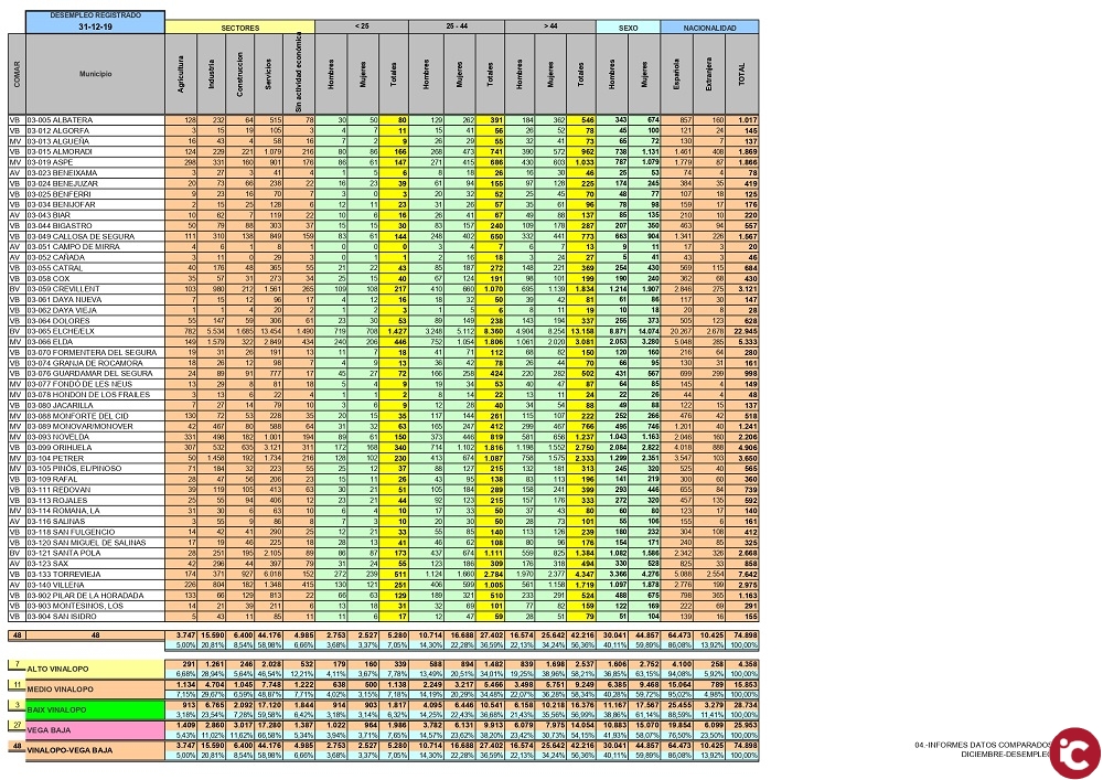 Los datos diferenciales entre Diciembre del actual año y Diciembre de 2018, la diferencia INTER-ANUAL entre ambos períodos es de 1.661 personas menos, de este total 572 son Hombres y 1.089 son Mujeres, esto es un dato positivo, pero se no debe bajar la guardia ya que los datos positivos enseguida se pueden ver en proceso de retroceso. Aquí también en todas las Comarcas hay una disminución y en los municipios con la excepción de Santa Pola que tiene un aumento de 127 personas.