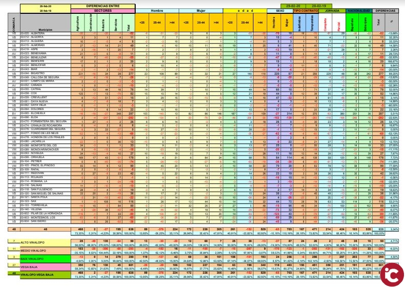 Los datos de los contratos realizados se pueden observar en las 48 ciudades que componen las comarcas del Vinalopó y Vega Baja. Esta cifra de contratos no quiere decir que se haya contratado al mismo número de personas, ya que la media por contrato por persona en España está en 1.36 de todos los contratos, del 1.40 en la contratación temporal y del 1.01 en la contratación indefinida.
