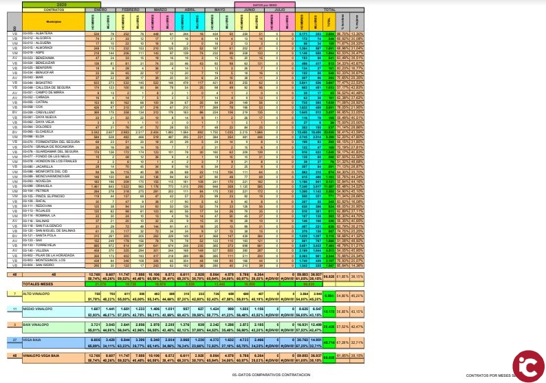 Los datos de los contratos realizados se pueden observar en las 48 ciudades que componen las comarcas del Vinalopó y Vega Baja. Esta cifra de contratos no quiere decir que se haya contratado al mismo número de personas, ya que la media por contrato por persona en España está en 1.23 de todos los contratos, del 1.26 en la contratación temporal y del 1.02 en la contratación indefinida.