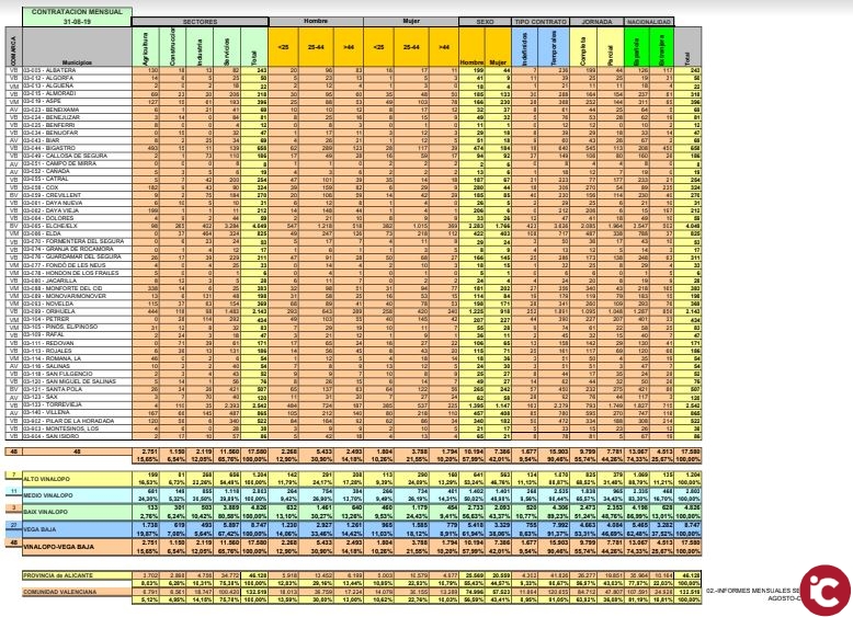 Los datos de los contratos realizados se pueden observar en las 48 ciudades que componen las comarcas del Vinalopó y Vega Baja. Esta cifra de contratos no quiere decir que se haya contratado al mismo número de personas, ya que la media por contrato por persona en España está en 1.37 de todos los contratos, del 1.40 en la contratación temporal y del 1.01 en la contratación indefinida.