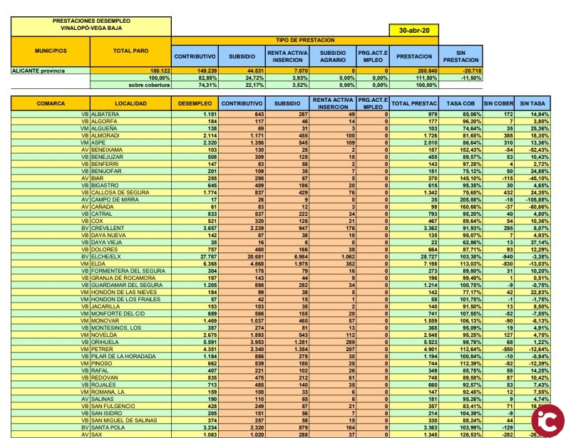 En el mes de Abril, la cobertura de las personas en paro en el ámbito de Vinalopó-Vega Baja ha sido de 89.414. (1).