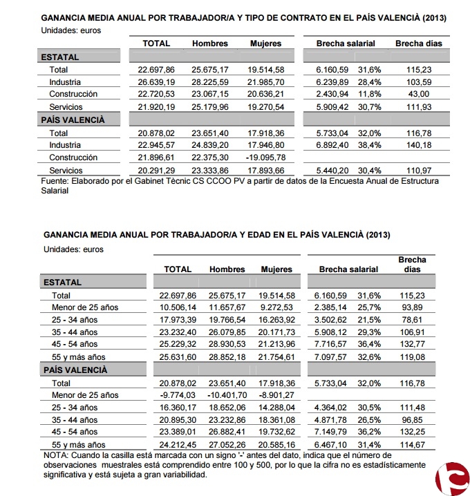 Según el último dato que ofrece la Encuesta Anual de Estructura Salarial (INE) en el País Valenciano el salario medio anual de las mujeres debería incrementarse un 32% para equipararse al de sus compañeros. La diferencia entre ambos es de 5.733 euros, lo que equivale a que ellas perciben 409 euros mensuales menos.