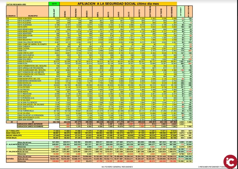 Analizando estos datos y en relación a los del anterior mes, se observa un aumento en el conjunto de las Comarcas Vinalopó-Vega Baja de 4.842 personas en las afiliaciones de la Seguridad Social del territorio. El total acumulado desde Diciembre al 30 de Noviembre es de 7.262 personas más afiliadas a la Seguridad Social.