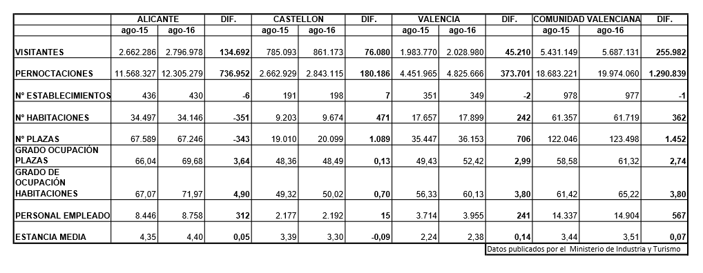 De enero a agosto el sector turístico ha crecido en viajeros un 4,71% y un 6,91% en pernoctaciones respecto al mismo periodo de 2015. El número de turistas internacionales ha aumentado en un 10,21% y sus pernoctaciones en un 12,90%. Se incrementa la facturación por habitación ocupada en un 6,79%.