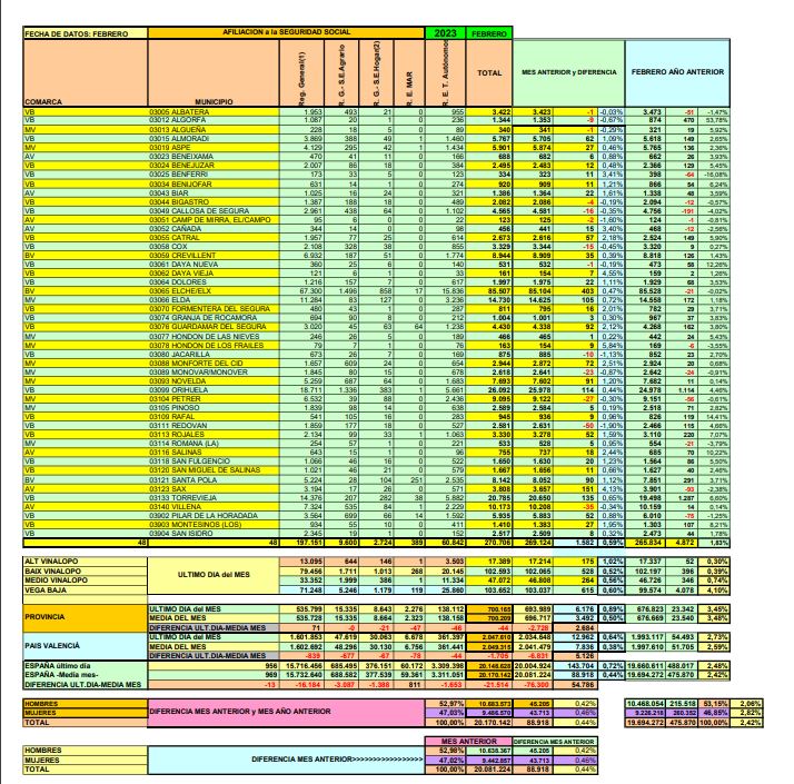 Con los datos de que disponemos desde CCOO Vinalopó-Vega Baja realizamos el cierre del mes de Febrero de la afiliación a la Seguridad Social.