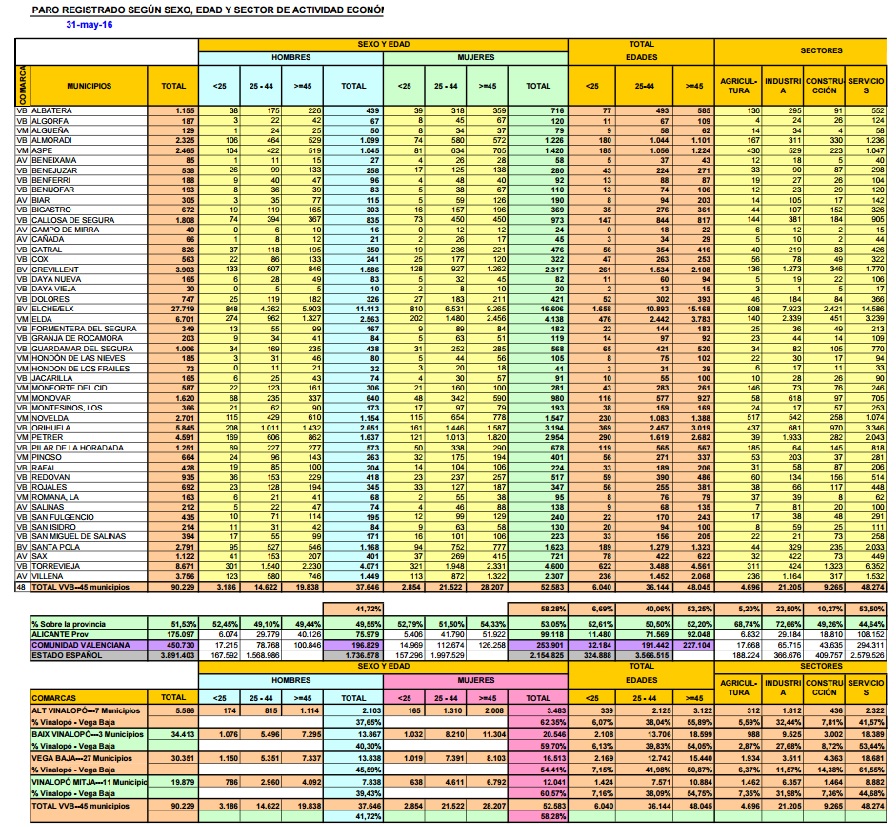 El número de personas en situación de Desempleo Registrado al finalizar el 31 de MAYO, y de acuerdo con los datos facilitados por el SEPE y SERVEF, adjuntamos informes elaborados por CCOO VINALOPO-VEGA BAJA, del resultado de dichos informes los datos al mes de Mayo en relación a las personas registradas en el DESEMPLEO son en total las siguientes: