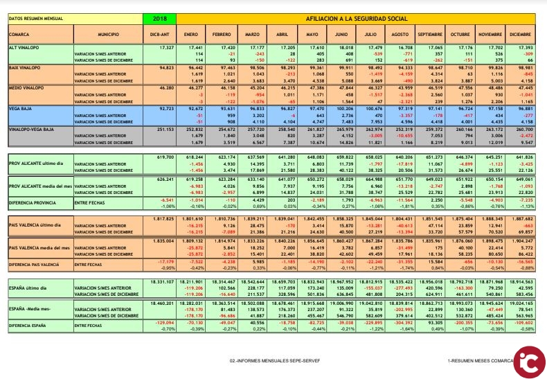 Desde la UI CCOO Vinalopó-Vega Baja realizamos un registro evolutivo de los datos de afiliación a la Seguridad Social. Adjuntamos la información correspondiente a los datos del mes de Diciembre desagregados por municipios, comarcas del Vinalopó y la Vega Baja, provincia de Alicante, Comunitat Valenciana y España.