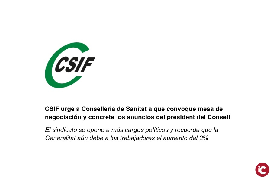 El sindicato adelanta, igualmente, en alusión al cuarto anuncio de creación de un nuevo Servei Valencià de Salut y de nombramiento de una comisionada para la transformación de la Atención Primaria, que nos opondremos a incrementar todavía más el número de cargos políticos. Queremos que sean funcionarios de carrera quienes gestionen cualquier cambio. CSIF ha insistido en la necesidad de concretar y dialogar sobre estas medidas en sus foros correspondientes, las mesas de negociaciones, para que los representantes de los trabajadores puedan realizar aportaciones y presentar alegaciones. En esta línea, la central sindical reclama la convocatoria urgente de la Mesa Sectorial de Conselleria de Sanidad Universal para detallar los anuncios del president del Consell.