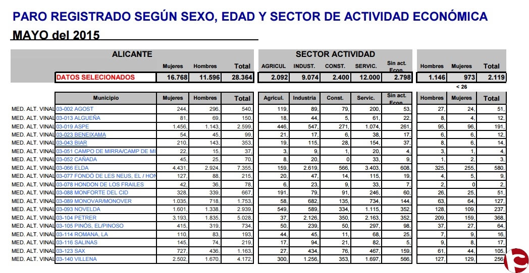 1) En el mes de mayo de 2015 el desempleo, en la comarca Medio Alto Vinalopó, ha sido positivo con una bajada de 1.235 trabajadores/ as alcanzando la cifra total de 28.364 Se reduce tanto el desempleo masculino (651) como en el femenino (584), aunque este último en menos cuantía. La tasa de desempleo masculino se sitúa en 11.596 mientras que la femenina con un total de 16.768. Con estos datos UGT sigue viendo que la desigualdad por sexo sigue existiendo en el mercado de trabajo.