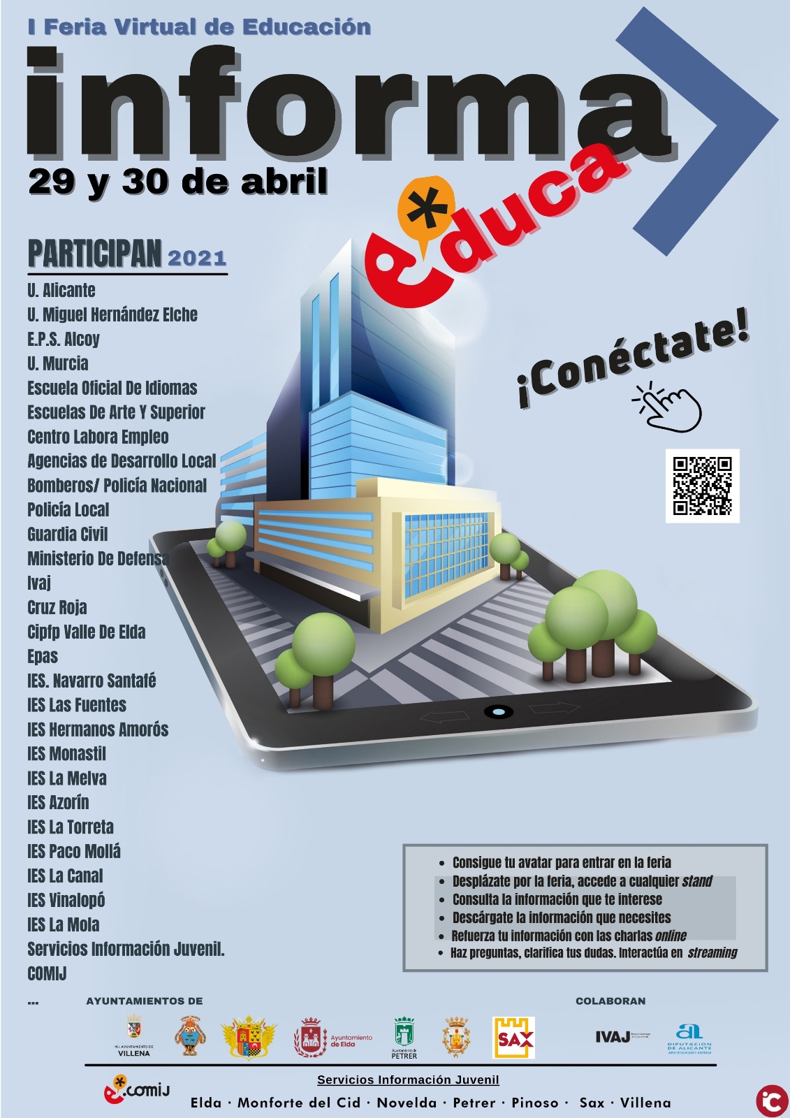 La feria, programada para los días 29 y 30 de abril y organizada por las concejalías de Juventud de Novelda, Elda, Petrer, Sax, Villena, Monforte del Cid y Pinoso, permitirá a todos sus participantes interactuar, a través de avatares propios desarrollados por la plataforma tecnológica, en un mundo virtual que representa una feria convencional en la que podrán conocer toda la oferta de Formación Profesional, universitaria y profesional accesible desde las comarcas del Vinalopó.