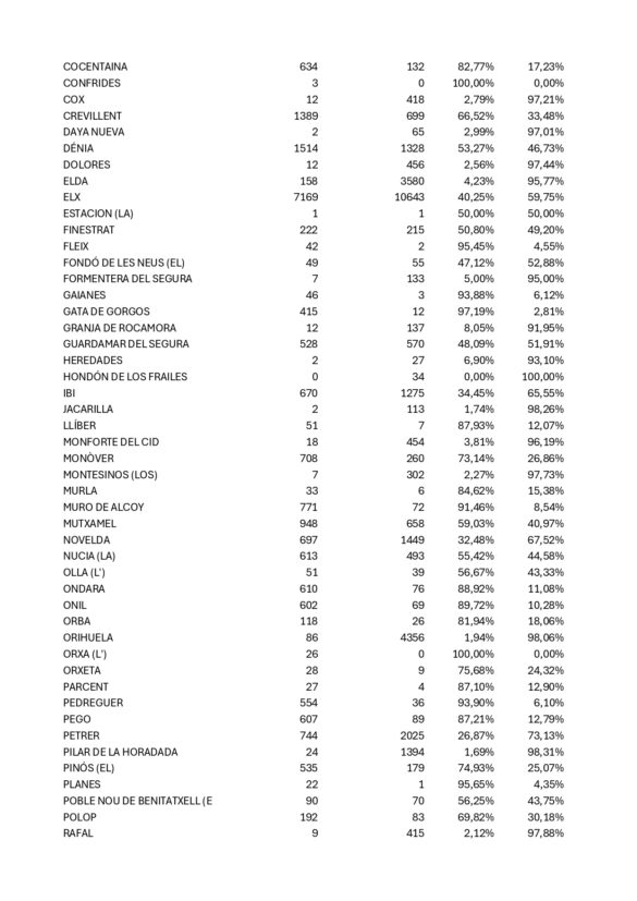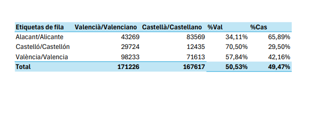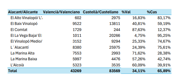 La distribució de la preferència lingüística de les famílies per comarques a la província d´Alacant ha sigut la següent (Font GVA):