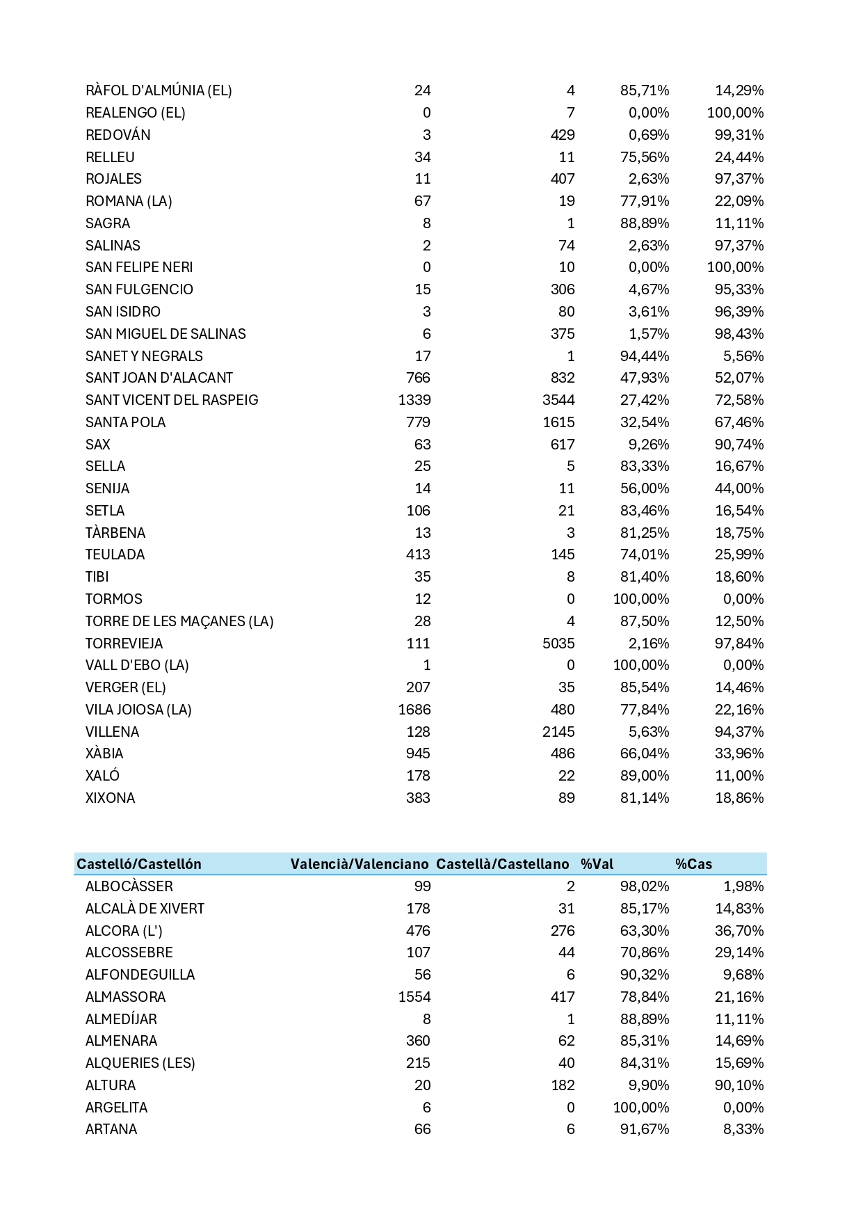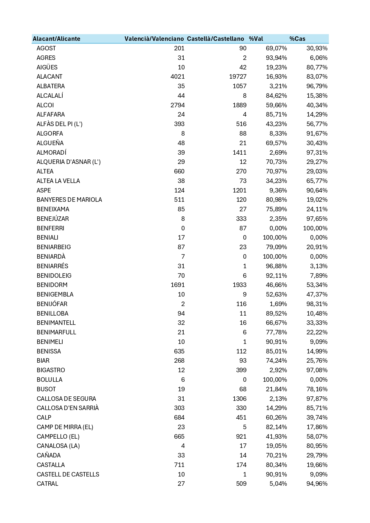 La distribució de la preferència lingüística de les famílies per comarques a la província d´Alacant ha sigut la següent (Font GVA):