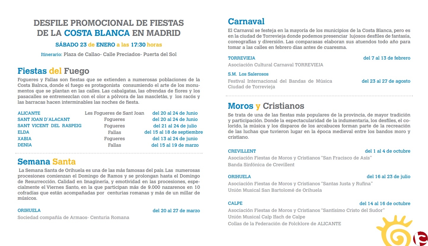 El objetivo de esta original propuesta es promocionar en Madrid las fiestas locales de la Costa Blanca, algunas de ellas declaradas de Interés Turístico Internacional o Nacional. Este año el Patronato Provincial ha incrementado en un 18% la aportación a las asociaciones festeras de la provincia para la difusión de estos festejos, ya que los considera uno de los ejes claves para conseguir la desestacionalización de la oferta e incrementar la llegada de visitantes durante todo el año, con un calendario anual plagado de celebraciones.