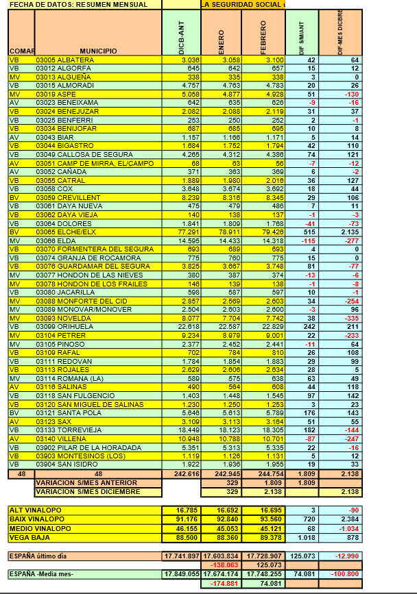 Estos datos y analizando en relación a Enero ha habido un aumento en las afiliaciones de la Seguridad Social de 1.809 personas, como se puede observar en el informe que recoge en los datos aportados de TODOS LOS REGIMENES. Todos los datos se pueden ver por municipios, en los que se observa el seguimiento de la afiliación. Por Comarcas se producen datos muy diferentes, mientras en el Baix Vinalopó supone un aumento de 720 personas mas, en el resto de Comarcas, y como dato a resaltar de forma negativa es el caso de la Comarca Medio Vinalopó que supone una disminución de 1.034 personas sobre el mes de Diciembre, mientras que en esta Comarca el aumento sobre Enero ha sido de 68 personas.