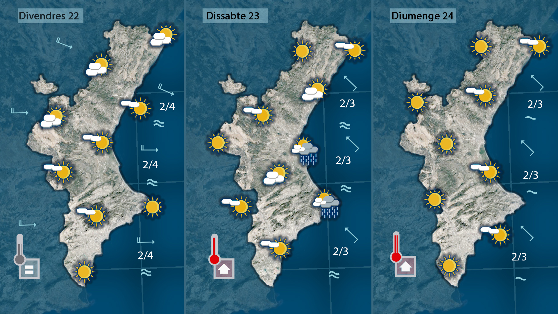 Intervals de núvols més compactes al nord, i més prims i menys abundants com més cap al sud amb temperatures més baixes al nord i amb pocs canvis al sud.