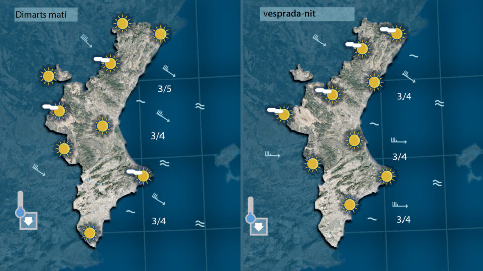 Començarem el dia dimecres a l’aguait d’un front que a última hora de la vesprada o a poqueta nit deixarà ruixats al nord i per l’interior. Fins eixe moment el dia serà assolellat, amb pas de núvols i temperatures altes amb valors per damunt dels 20 graus a la costa i al sud.