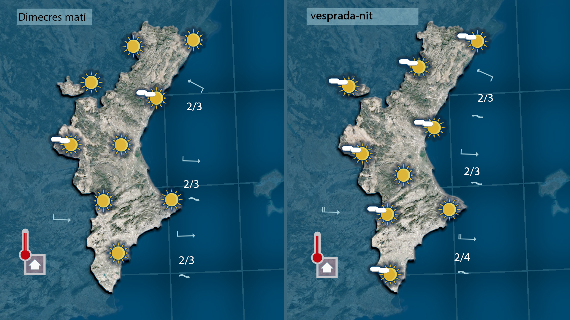 Demà dijous el ponent es deixarà sentir amb ratxes moderades apropant un front de núvols des del ponent de la Península que al seu davant portarà temperatures més altes i una volta ens haja creuat la massa d’aire al seu darrere serà prou més freda.