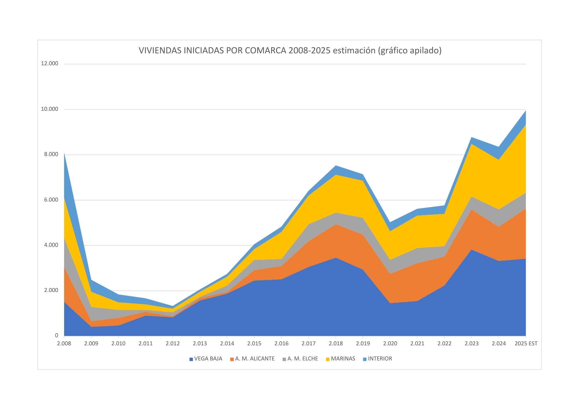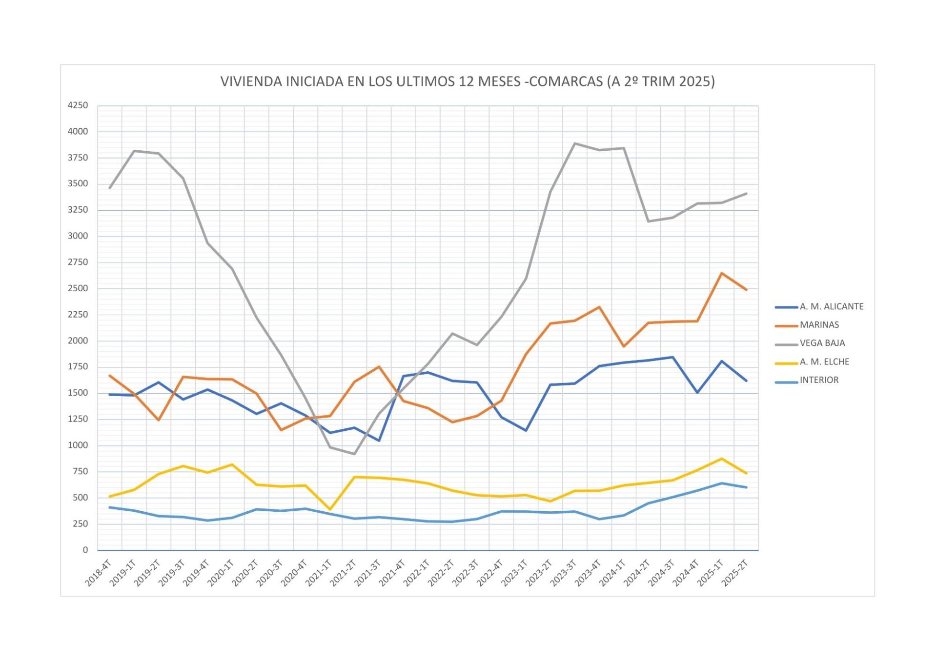 La Marina Alta y la Marina Baja es la segunda área con mayor volumen de la provincia con un total de 701 viviendas iniciadas en el segundo trimestre de 2025, lo que supone un descenso del 18% respecto a 2024 y de un 12% con respecto a las 801 viviendas del primer trimestre. En cuanto al acumulado del año, con 1.502 viviendas iniciadas, incrementa en un 25% la cifra del año pasado.