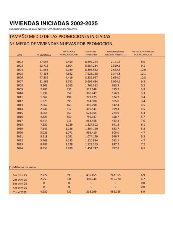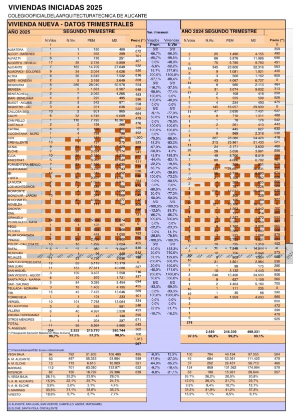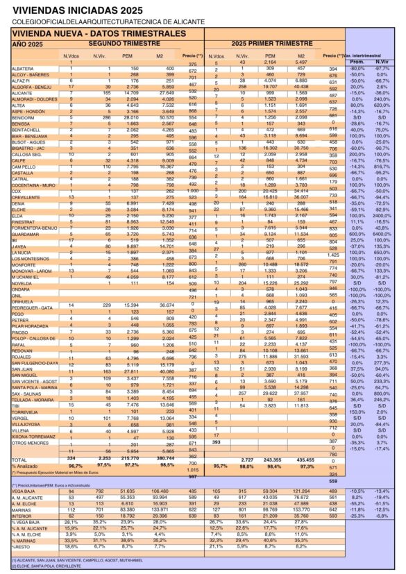 La construcción de vivienda en la provincia de Alicante ha registrado 2.253 viviendas iniciadas durante el segundo trimestre de 2025, una cifra que supera a 31 de los últimos 36 trimestres según las estadísticas de visados del Colegio Oficial de la Arquitectura Técnica de Alicante (COATA), unos datos que muestran una moderación del ritmo en este periodo. El acumulado de enero a junio alcanza 4.980 viviendas iniciadas, un 11% más que en 2024.