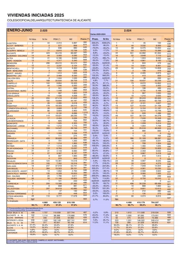 Respecto a los datos de acumulado del año, de enero a junio se han iniciado en la provincia de Alicante 4.980 viviendas, frente a las 4.468 de 2024, lo que supone un incremento de un 11%.