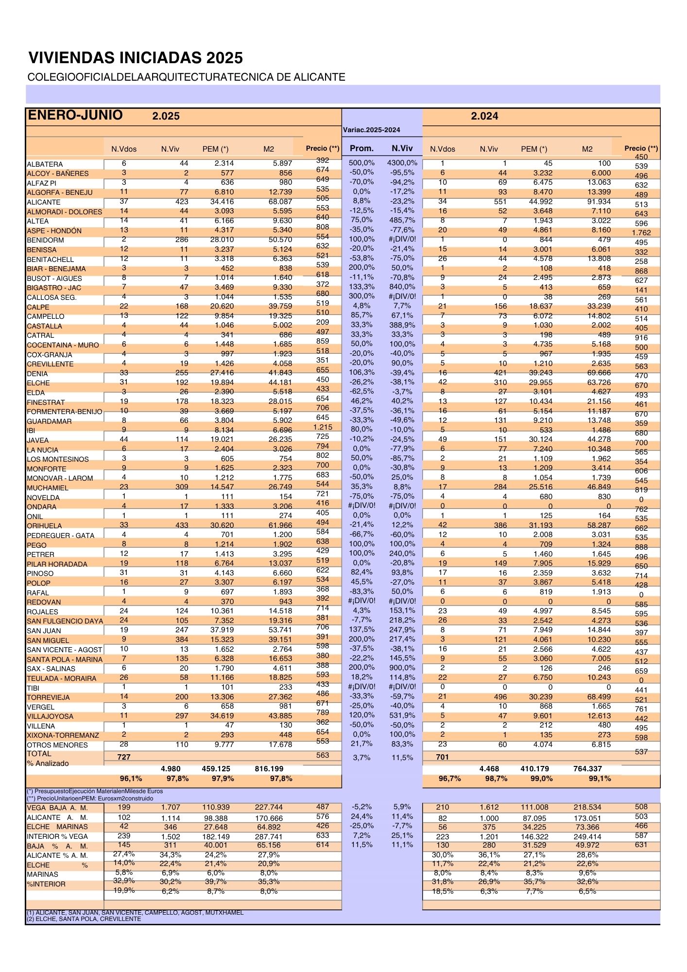 Los datos del acumulado de enero a junio muestran a Orihuela en primer lugar con 433 viviendas iniciadas, seguido de Alicante con 423 y de San Miguel con 384. En cuarto lugar, Mutxamel con 309 y en quinto Villajoyosa con 297, ya por debajo de las 300 viviendas.