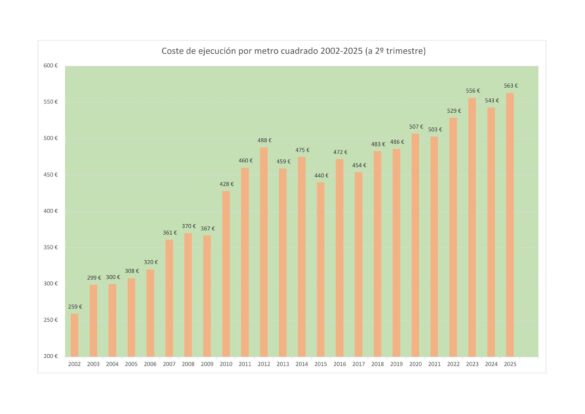 El coste medio de ejecución por metro cuadrado se ha situado en 563€ lo que supone un incremento del 3,7% respecto a la cifra final del pasado año.
