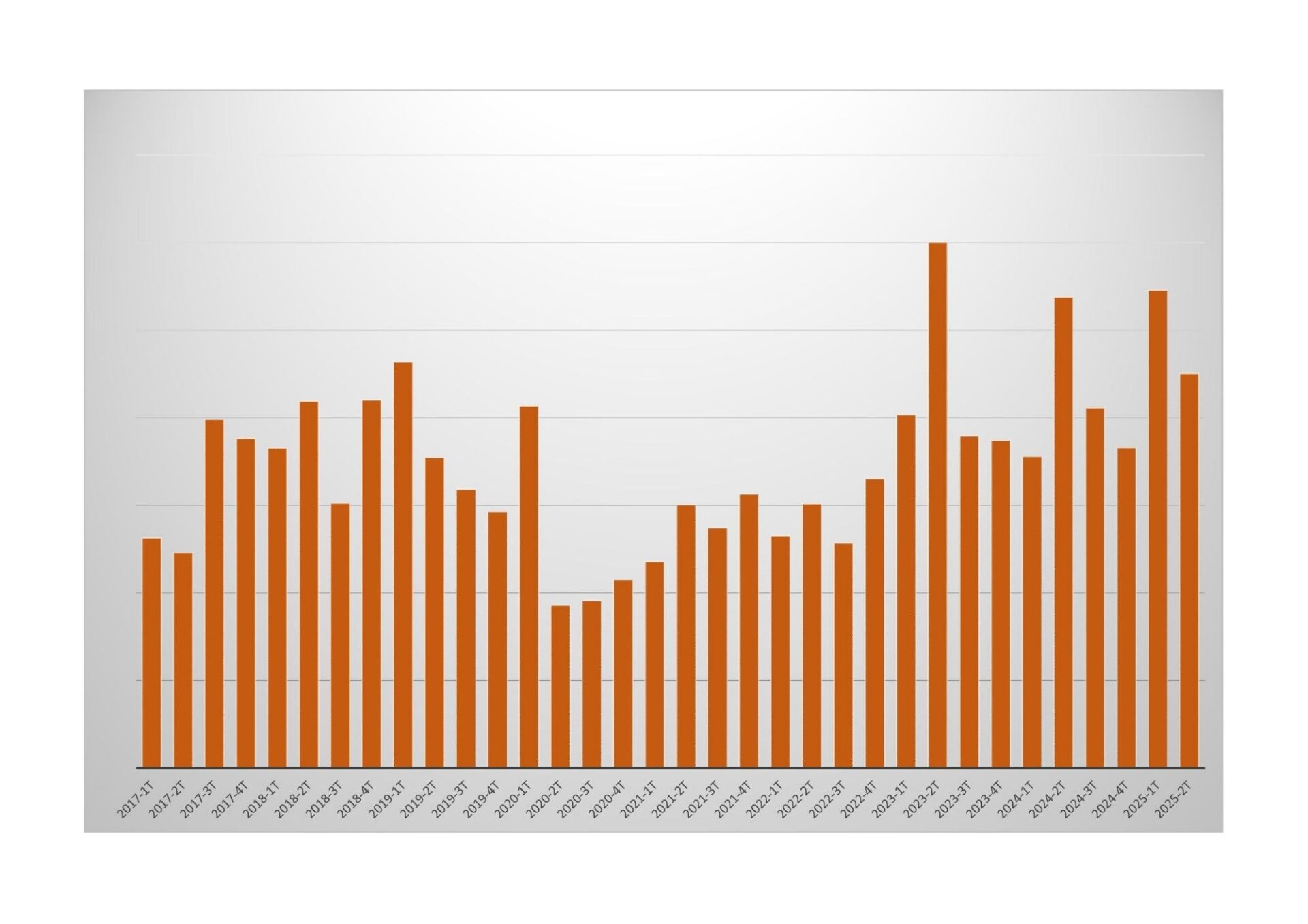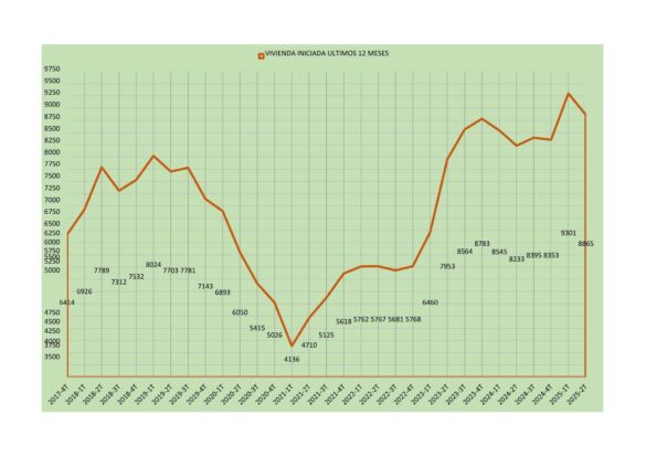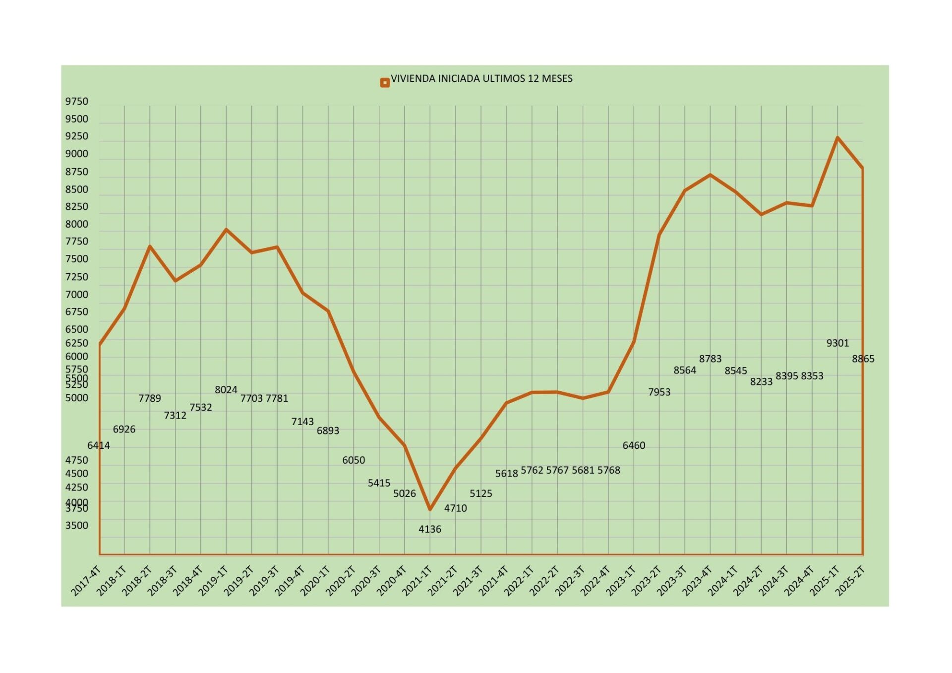 Los datos de vivienda iniciada en los últimos 12 meses muestran un descenso tras estos datos, situándose en 8.865 viviendas frente a las 9.301 del trimestre anterior. Sin embargo, el segundo trimestre de 2025 sigue por encima del máximo anterior, del cuarto trimestre de 2023.