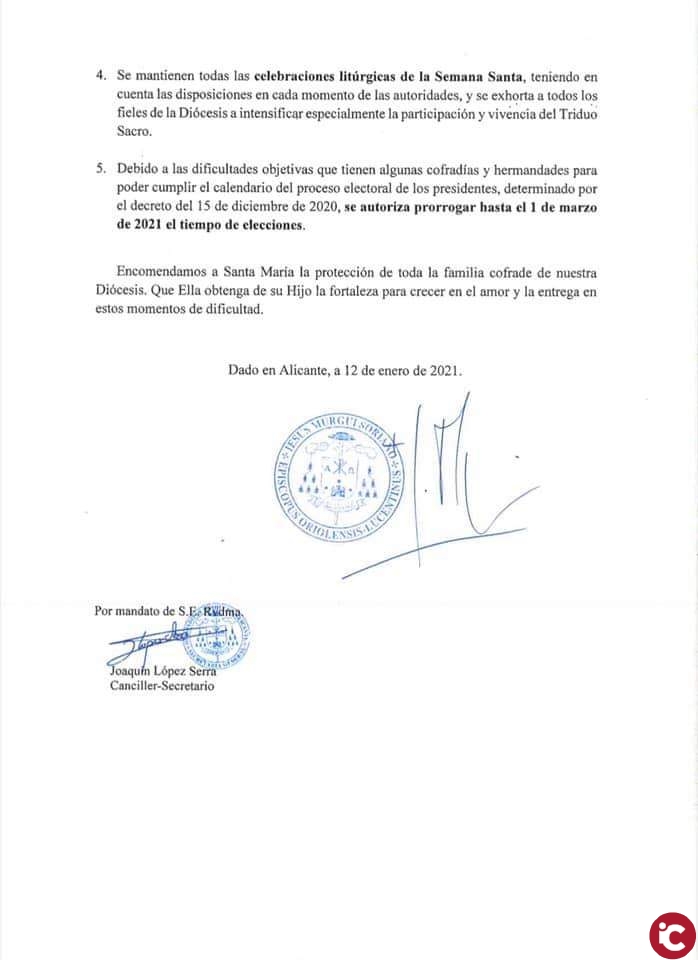 El obispo de Alicante-Orihuela, Jesús Murgui, ha firmado el decreto por el que se suprimen todos los desfiles de Semana Santa y las estaciones de penitencia en la Diócesis que estaba previsto que celebraran en 2021 en la vía pública.