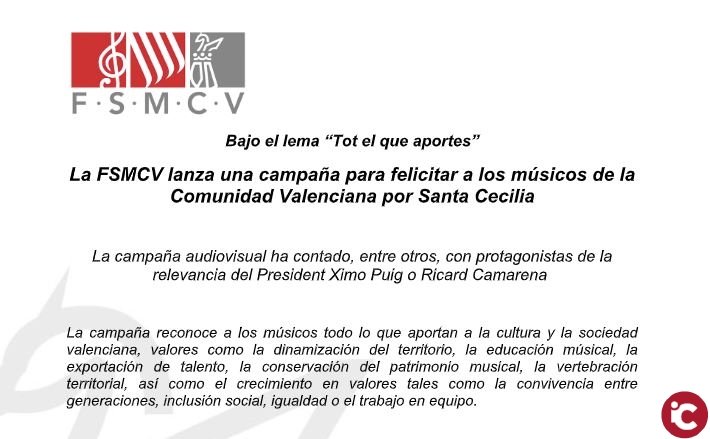 ¿Te has parado a pensar en todo lo que aportas como músico? Con esta pregunta, la Federación de Sociedades Musicales de la Comunidad Valenciana lanza su campaña audiovisual ‘Tot el que aportes’, dirigida a los miles de músicos de la Comunidad Valenciana como celebración de la festividad de Santa Cecilia, patrona de los músicos.