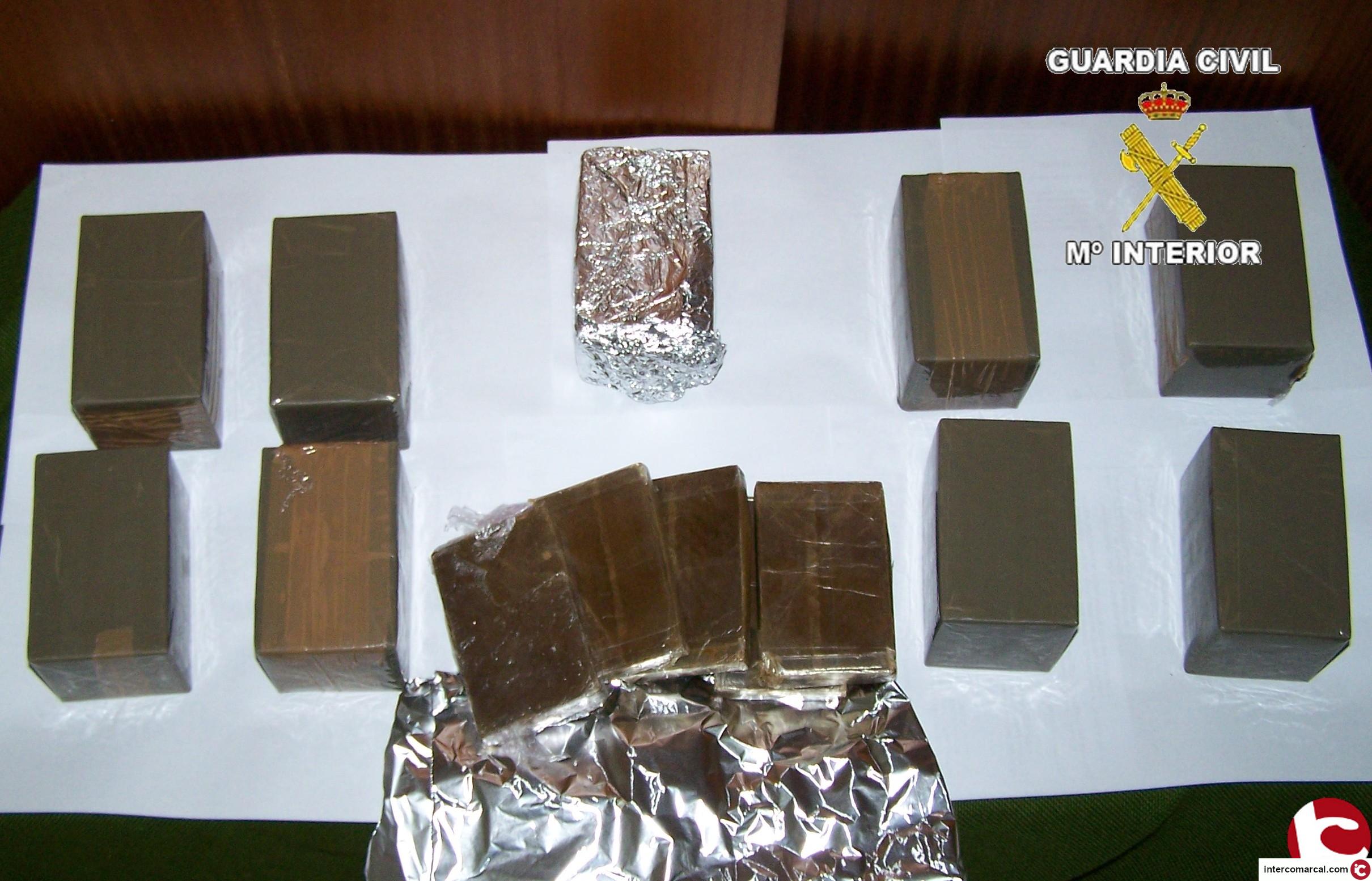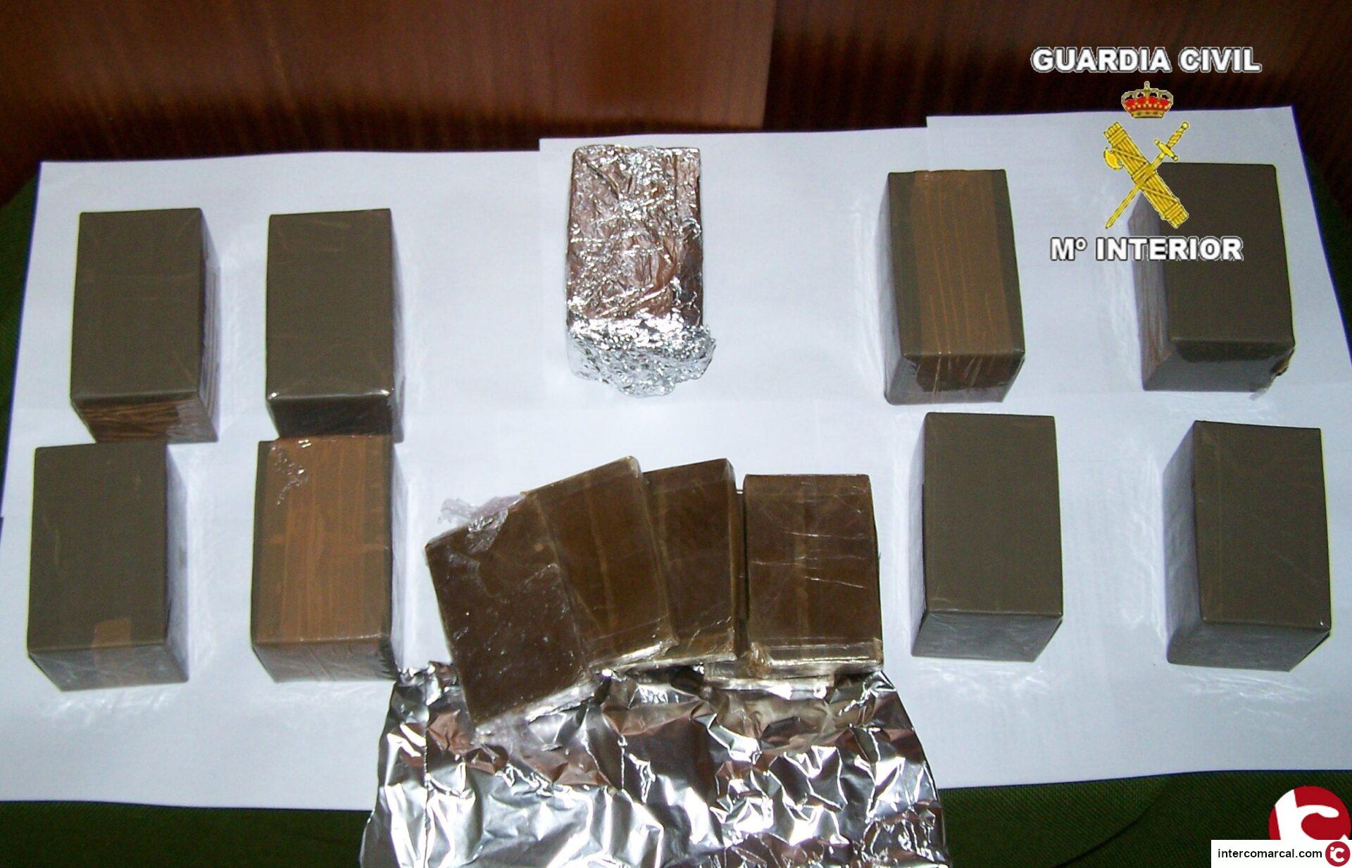 En punto de verificación y control de personas y vehículos, la Guardia Civil interceptó sobre las 21 horas del pasado día 11, una furgoneta. Al efectuar un registro del citado vehículo, se encontraron, ocultos bajo el asiento del copiloto, 5 kg de hachís, distribuidos en 10 paquetes, con varias planchas de unos 100 gramos en cada paquete.