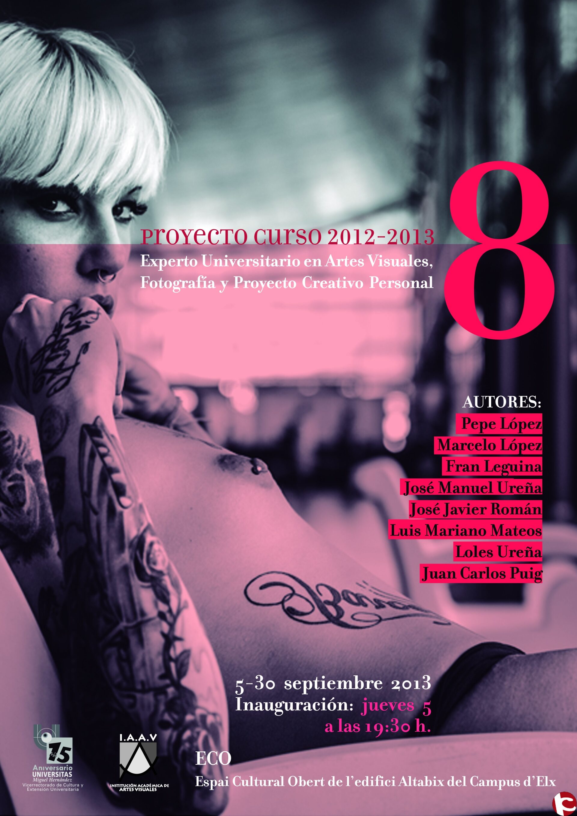 El Vicerrectorado de Cultura y Extensión Universitaria de la Universidad Miguel Hernández (UMH) de Elche presenta la exposición fotográfica 8 Proyectos de los alumnos del curso Experto Universitario en Artes Visuales, Fotografía y Proyecto Creativo Personal. La exposición se inaugurará mañana jueves, 5 de septiembre, a las 19:30 horas, en el Espai Cultural Obert (ECO) del edificio Altabix del campus de Elche.