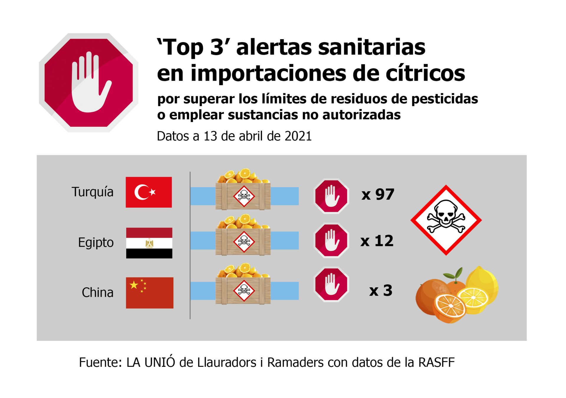 LA UNIÓ de Llauradors informa que Turquía y Egipto acaparan en lo que llevamos de año prácticamente todas las alertas sanitarias por residuos de pesticidas en importaciones de cítricos que se han detectado en la Unión Europea (UE), tanto por superar el límite máximo (LMR) como por emplear sustancias no autorizadas en la UE como el clorpirifos o el metil clorpirifos para luchar contra las plagas o el prochloraz para tratamientos poscosecha.