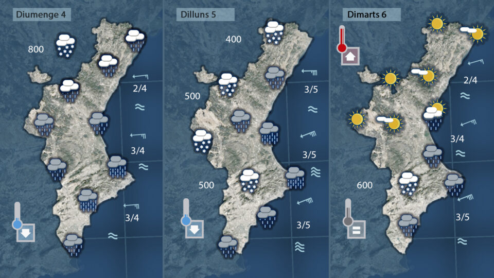 Dilluns serà un dia fred i plujós amb una cota de neu que estarà engre els 400 i els 500 metres deidant una vesprada de cavalgades de rigorós hivern, i dimarts els núvols començaran a escampar al nord però al sud encara plourà durant bona part del matí amb una cota de neu que tot i començar a pujar encara esyarà al voltanyt dels 600 metres.
