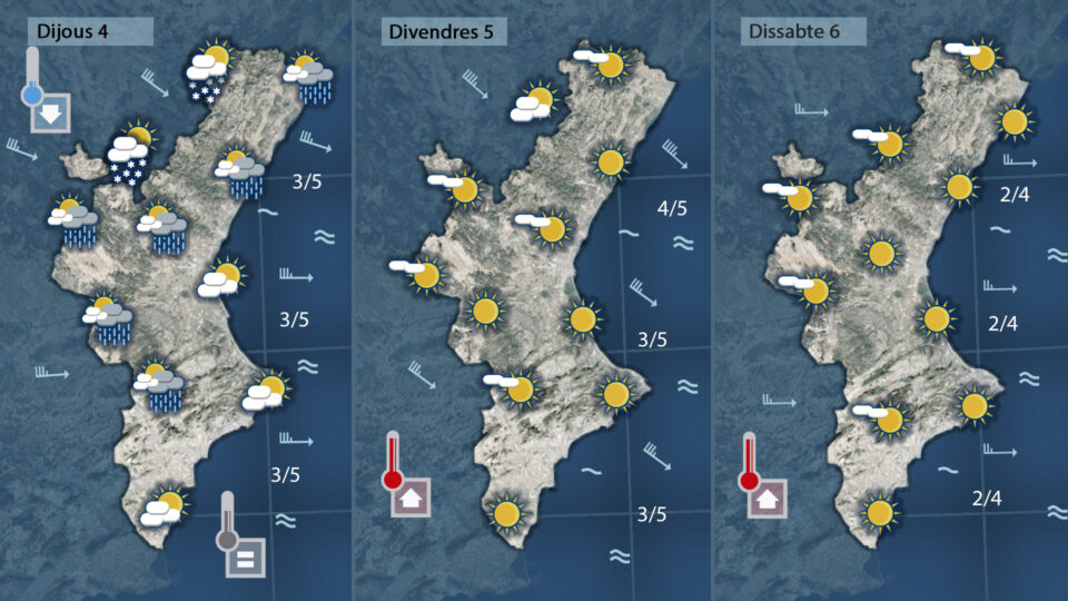 Demà dimecres tornarà a ser un dia lleig i antipàtic per culpa del vent que es reforçarà i farà baixar les temperatures. Potser a primera hora puga caure alguna gota al sud però no tardarà en imposar-se el sol per tot arreu.